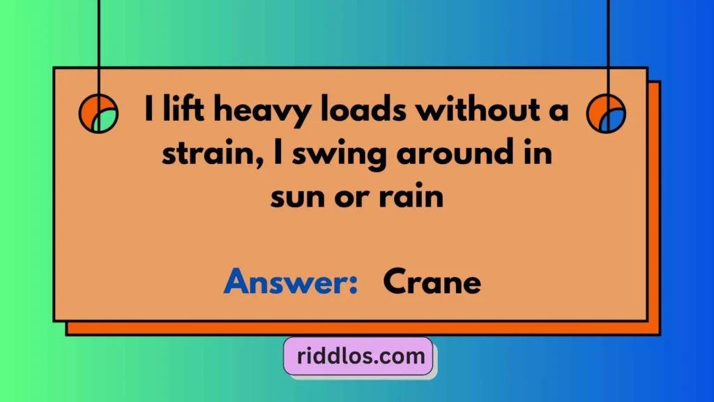 - Riddle: I lift heavy loads without a strain, I swing around in sun or rain.
