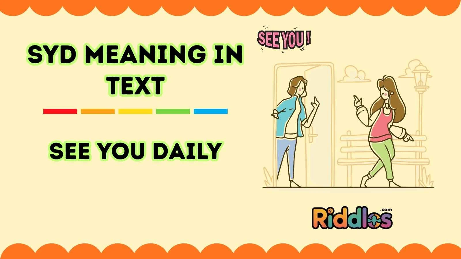 SYD is a texting abbreviation that stands for “See You Daily”, “See You Later”, or sometimes “Say Your Details”, depending on the context.